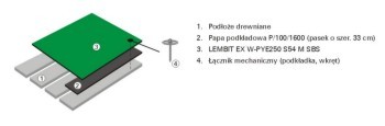 2.W celu ochrony podłoża drewnianego (1) przed płomieniem w czasie zgrzewania zakładów w papie wierzchniego krycia (3) należy zastosować przekładkę (2) z papy asfaltowej podkładowej typu P/100/1600 S23 o szer. do 33cm. Przekładka przymocowana jest łącznikami mechanicznymi (4) wraz z papą wierzchniego krycia do podłoża. Chroni podłoże przed płomieniem palnika podczas wykonywania zakładów w papie zgrzewalnej wierzchniego krycia modyfikowanej SBS typu LEMBIT EX W-PYE250 S54 M SBS. Przekładkę i papę wierzchniego krycia mocujemy za pomocą łączników mechanicznych (podkładka, wkręt kpl.).