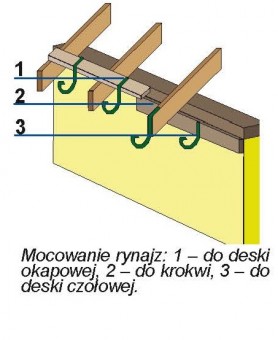 w kierunku rury spustowej. Mocuje się je do okapu dachu za pomocą