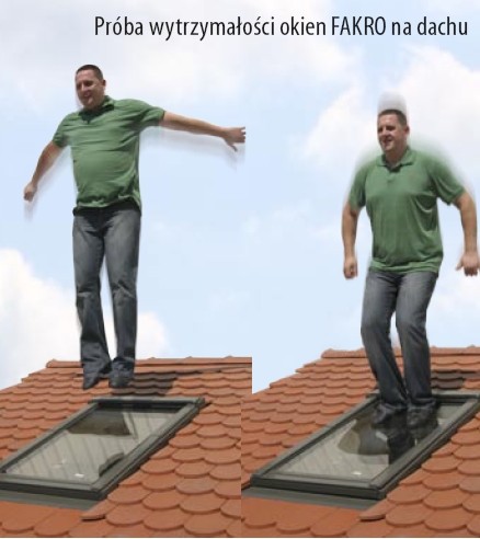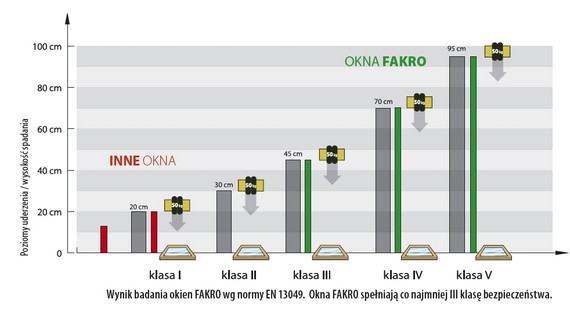 wysokiej jakości, trwałe i bezpieczne okna dachowe. Jako pierwsza wprowadziła na rynek min. okna standardowo wyposażone w szybę hartowaną, która objęta jest bezterminową gwarancją na rozbicie przez grad. Co więcej, konstrukcja okna jest specjalnie wzmocniona dzięki czemu wszystkie okna FAKRO jako jedyne posiadają III klasę bezpieczeństwa dla całego okna łącznie z szybą wg normy EN 13049. Okna dachowego FAKRO nie da się w łatwy sposób otworzyć, np. poprzez dynamiczne naciśnięcie nogą na górną, zewnętrzną część okna. Nie spowoduje to otwarcia skrzydła bądź wyrwania zawiasów. Kominiarz lub osoba z ekipy remontującej dach nie wpadnie przez okno, jeżeli przypadkowo nadepnie na skrzydło. Daje to gwarancję bezpiecznego użytkowania budynku.