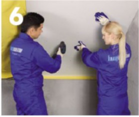 Odmierzamy odcinki wełny mineralnej Ekoroll lub Unifit lub Classic równe odległości pomiędzy krokwiami z 2 cm naddatkiem. Maty Unifit posiadają specjalne oznaczenie "---" co pozwala na łatwe odmierzenie i przycięcie odpowiednich odcinków izolacji. Ponieważ maty Knauf Insulation są skompresowane po rozpakowaniu rolki wełna ulega rozprężeniu do swojej deklarowanej grubość.