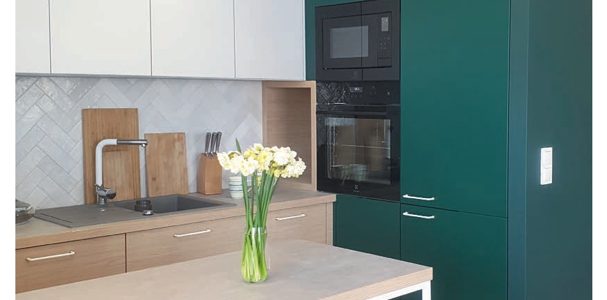 Współpraca z projektantką polegała na wyborze takich form wyposażenia oraz materiałów i kolorów, które dałoby się powtórzyć we wszystkich pomieszczeniach – to gwarancja spójności aranżacji i najlepszy sposób na uniknięcie estetycznego chaosu. Panie postawiły na jasne drewno na posadzce (dębowa deska trójwarstwowa), okleiny w tym samym kolorze i fakturze zastosowano na frontach mebli we wszystkich pomieszczeniach. W zabudowie kuchennej wykorzystano trzy rodzaje frontów. Wiszące bezuchwytowe szafki wykonano z białego MDF-u – tworzą one jednolitą płaszczyznę powiększającą optycznie wnętrze, fronty dolnych szafek wykończono drewnopodobną okleiną, zaś usytuowany prostopadle słupek z lodówką, piekarnikiem i mikrofalówką pomalowano na kolor butelkowej zieleni. Konsekwentnie kolor ten przedłużono na ścianie salonu przechodzącej w ścianę przedpokoju, powtórzono we wnęce na biurko w sypialni. Udało się też wprowadzić tę barwę do łazienki – błyszczące płytki cegiełki ułożone w modną jodełkę na ścianach prysznica mają ciemny odcień butelkowej zieleni. Właścicielka zamówiła w tym kolorze również miękkie tkaninowe panele, którymi chce wyłożyć siedzisko w przedpokoju oraz zagłówek łóżka w sypialni. Ten sam odcień głębokiej zieleni mają liście palmy ta[1]pety w pokoju dziennym oraz rośliny doniczkowe wypełniające kuchenny parapet. Spójność zapewniają również okładziny ceramiczne – płytki ścienne w kuchni i łazience są z tej samej kolekcji i tak samo ułożone, róż[1]nią się jedynie kolorem. Na podłogę do kuchni, łazienki i przedpokoju wy[1]brano jeden rodzaj gresu – to wielkoformatowe płytki o modnej pół[1]polerowanej powierzchni nazywane lappato. Połyskująca powierzchnia okazała się atrakcyjnym wyborem również jako forma okładziny łazienkowych ścian.