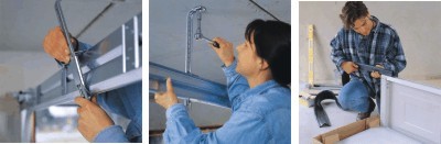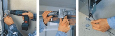 20. Następnie podwieszamy prowadnice za pomocą wcześniej zamocowanego uchwytu. Dyble i śruby wkręcamy do stropu. W ten sposób została wykonana i usztywniona konstrukcja bramy.