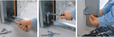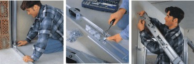 12. Wstępnie zmontowane prowadnice górne należy osadzić w ościeżnicy i przymocować śrubami.